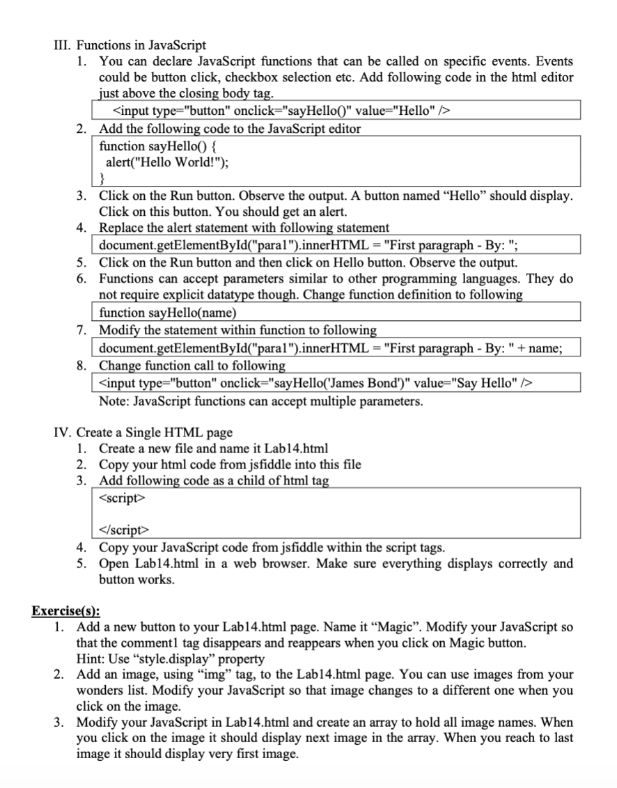 About HTML Preprocessors. HTML preprocessors can make writing HTML more powerful or convenient. For instance, Markdown is designed to be easier to write and read for text documents and you could write a loop in Pug. 3/10/2020 · JavaScript - Create an alert on clicking an HTML button. Javascript Web Development Front End Technology Object Oriented Programming. To fire an alert on click of a button, use addEventListener (). Let’s say the following is our button on an HTML web page −. <button type="button">Please Press Me</button>. The button object in HTML is used to represent a <button> element. The getElementById () method is used to get the button object. Creating button object: The button object can be created using JavaScript. The document.createElement () method is used to create <button> element.