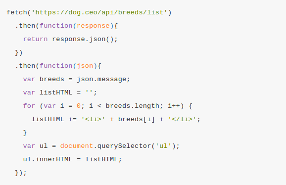 On the other hand, fulfilled is one of 3 states a promise can be in, and once a promise transitions to fulfilled, JavaScript executes any onFulfilled callbacks you passed to the then() function. With the Promise Constructor. When you create a promise using new, you call the Promise constructor. Promise.all takes an array of promises (it technically can be any iterable, but is usually an array) and returns a new promise.. The new promise resolves when all listed promises are resolved, and the array of their results becomes its result. For instance, the Promise.all below settles after 3 seconds, and then its result is an array [1, 2, 3]: A great example of chaining promises is the Fetch API, which we can use to get a resource and queue a chain of promises to execute when the resource is fetched. The Fetch API is a promise-based mechanism, and calling fetch() is equivalent to defining our own promise using new Promise(). Example of chaining promises