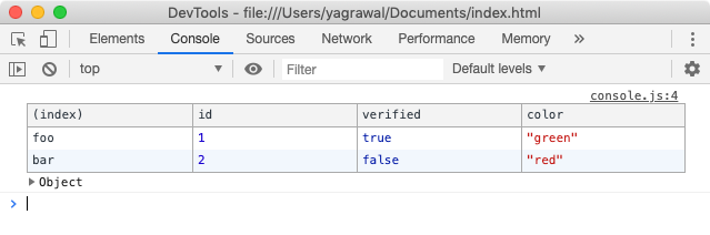 This interactive tutorial shows you how to run JavaScript in the Chrome DevTools Console. See Get Started With Logging Messages to learn how to log messages to the Console. See Get Started With Debugging JavaScript to learn how to pause JavaScript code and step through it one line at a time.. Figure 1.The Console. # Overview The Console is a REPL, which stands for Read, Evaluate, Print, and Loop. JavaScript: How to loop through all DOM elements on a page and display result on console? Display the dropdown's (select) selected value on console in JavaScript? Get number from user input and display in console with JavaScript; How to read data from PDF file and display on console in Java? To display the results, copy and paste the previous code snippet in the Console or navigate to Console messages examples: Logging with specifiers. Expand the information in the log to display the huge difference between %o and %O. Use specifiers to log and convert values. Expand the results displays the difference between the %O and %o ...
