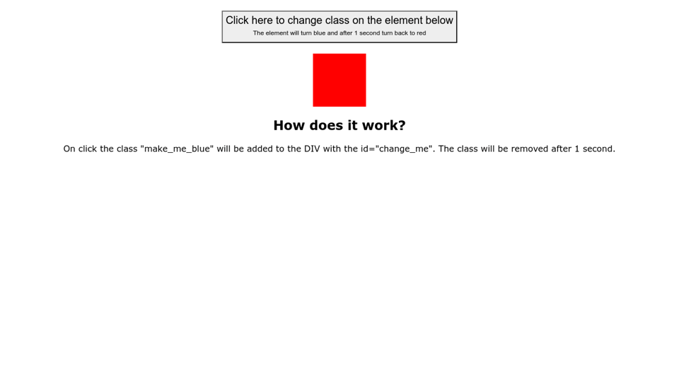 Javascript change class onclick. Aug 03, 2019 - How can I change a class of an HTML element in response to an on-click event using JavaScript? Well organized and easy to understand Web building tutorials with lots of examples of how to use HTML, CSS, JavaScript, SQL, Python, PHP, Bootstrap, Java, XML and more. Description: Add or remove one or more classes from each element in the set of matched elements, depending on either the class's presence or the value of the state argument · This method takes one or more classes as its parameter. In the first version, if an element in the matched set ...