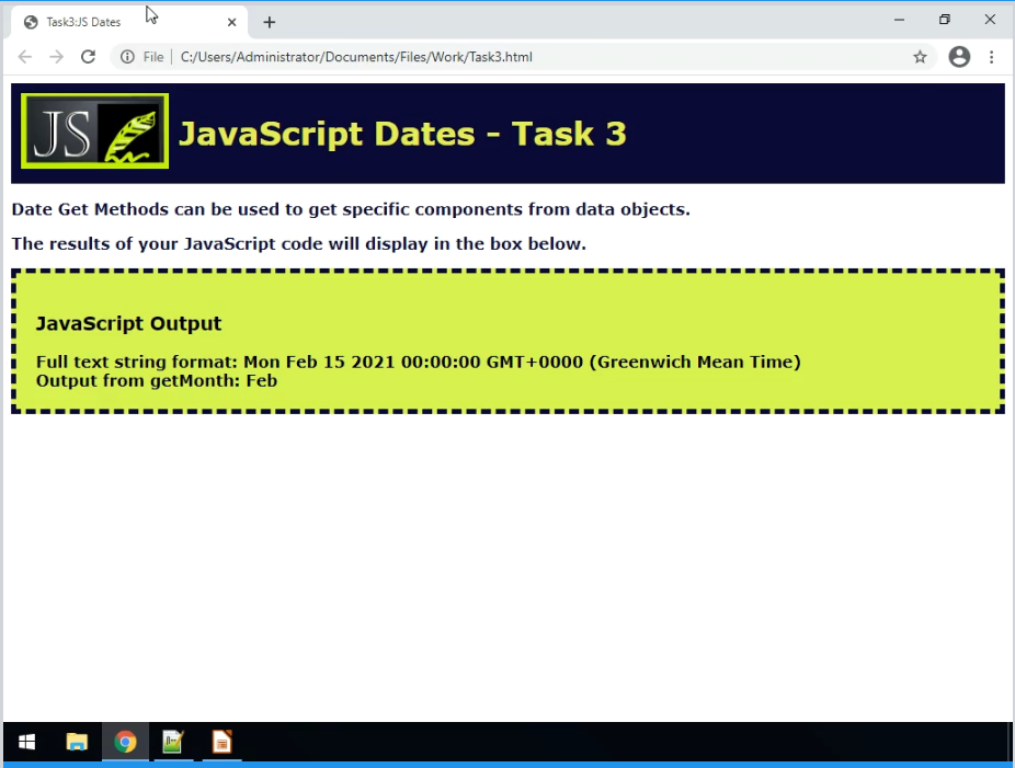 See the Pen JavaScript - Get the month end date-date-ex-53 by w3resource (@w3resource) on CodePen. Contribute your code and comments through Disqus. Previous: Write a JavaScript function to get the month start date. Next: javascript String Exercises These methods can be used for getting information from a date object: Method. Description. getFullYear () Get the year as a four digit number (yyyy) getMonth () Get the month as a number (0-11) getDate () Get the day as a number (1-31) Output: 9. The date.getMonth() method is used to fetch the month(0 to 11) from given Date object.. Syntax: DateObj.getMonth() Parameter: This function does not accept any parameter. Return Value: It returns the Month for the given Date object. The month is an integer value ranging from 0 to 11. Zero (0) means January, 1 means February, and so on till 11 means December.