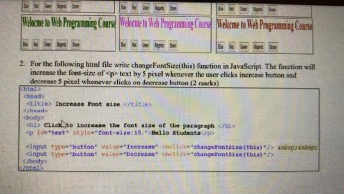 Here Mudassar Ahmed Khan has explained how to allow website visitors to change i.e. increase or decrease font size of text using JavaScript and jQuery. He has shown how to change i.e. increase or decrease the font size of text of whole page or particular section or part of page using JavaScript or jQuery There are multiple monitor dimensions and resolutions, thus sometimes users find it ... Using javascript (although this is only so it shows the selected size) write 4 links to change the font size. These call a javascript function that writes a new value for the font size to the cookie and then reload the page. I would say that it is all easily liftable from the page you reference. Well organized and easy to understand Web building tutorials with lots of examples of how to use HTML, CSS, JavaScript, SQL, Python, PHP, Bootstrap, Java, XML and more.