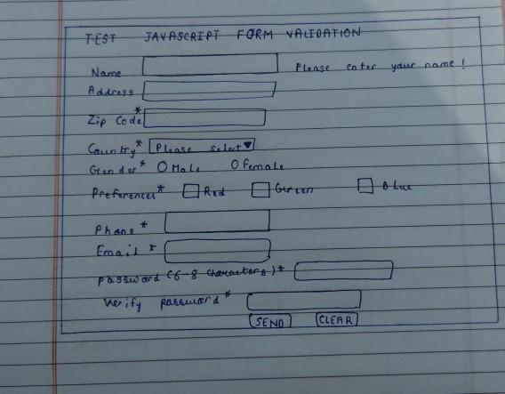 sample-registration-form-validation.js is the external JavaScript file which contains the JavaScript ocde used to validate the form. js-form-validation.css is the stylesheet containing styles for the form. Notice that for validation, the JavaScript function containing the code to validate is called on the onSubmit event of the form. This example gets the form's element list, then iterates over the list, looking for <input> elements of type "text" so that some form of processing can be performed on them. var inputs = document . getElementById ( "my-form" ) . elements ; // Iterate over the form controls for ( i = 0 ; i < inputs . length ; i ++ ) { if ( inputs [ i ] . nodeName === "INPUT" && inputs [ i ] . type === "text" ) { // Update text input … To access form fields, you can use DOM methods like getElementsByName (), getElementById (), querySelector (), etc. Also, you can use the elements property of the form object. The form.elements property stores a collection of the form elements. JavaScript allows you to access an element by index, id, or name.