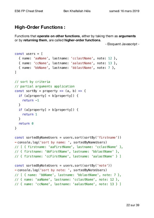 ES6 cheat sheet · Arrow function · const sum = (a, b) => a + b console.log(sum(2, 6)) // prints 8 · Default parameters · function print(a = 5) { console.log(a) } print() // prints 5 print(22) // prints 22 · let scope · let a = 3 if (true) { let a = 5 console.log(a) // prints 5 } ... Oct 17, 2018 - Prior to ES6, we implemented Classes by creating a constructor function and adding properties by extending the prototype: ES6 classes are a simple sugar over the prototype-based OO pattern. Classes… This is an interactive ES6+ cheatsheet. 13 sections, 47 runnable code samples.