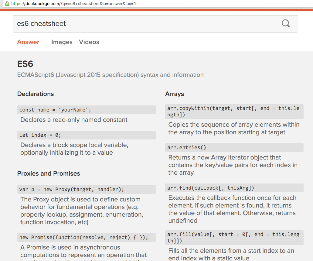 18/5/2016 · Since HTML5 and the birth of Node.js, the runtime that allows us to run JavaScript on the server or desktop, JavaScript has gained a unique momentum. There is a growing adoption rate among enterprises, embracing it into production, and thus its newest features were greatly awaited. We created this cheat sheet as a list of ES6 features we use ... Lebab - Turn your ES5 code into readable ES6. Lebab does the opposite of what Babel does. Babel (Formerly 6to5) - 🐠 Babel is a compiler for writing next generation JavaScript. es6-cheatsheet - ES2015 [ES6] cheatsheet containing tips, tricks, best practices and code snippets MEVN-CLI - Light speed setup for MEVN(Mongo Express Vue Node) Apps The Ultimate JavaScript Cheat Sheet (Codementor) View : Toptal's Quick And Practical JavaScript Cheat Sheet: ES6 And Beyond (Toptal) View : Top 50 JavaScript Plugins & Libraries (Speckyboy) View : jQuery. Perhaps the most popular JavaScript library, jQuery has withstood the test of time. The fact that it is included by default with WordPress ...
