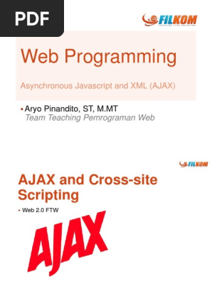 3/1/2010 · Hope this will save you a few hours and spare you from a headache. It took me a while to figure this out, but doing regular $.ajax() request ruined my PDF file, while requesting it through address bar worked perfectly. Solution was this: Include download.js: http://danml /download.html. Then use XMLHttpRequest instead of $.ajax() request. Asynchronous JavaScript and XML, while not a technology in itself, is a term coined in 2005 by Jesse James Garrett, that describes a "new" approach to using a number of existing technologies together, including HTML or XHTML, CSS, JavaScript, DOM, XML, XSLT, and most importantly the XMLHttpRequest object. When these technologies are combined in the Ajax model, web applications are able to make ... to reload the whole page. Together, AJAX and the DOM can be used to create dynamic Web pages, and this chapter will introduce you to how that can be done. AJAX stands for Asynchronous JavaScript and XML. It allows a Web page to make a request to a Web