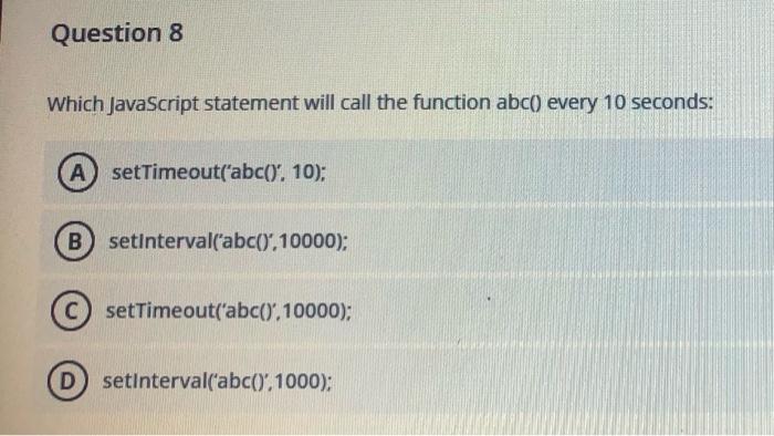 10/8/2012 · You can use JavaScript Timing Events to call function after certain interval of time: This shows the alert box every 3 seconds: setInterval (function () {alert ("Hello")},3000); You can use two method of time event in javascript.i.e. setInterval (): executes a function, over and over again, at specified time intervals. Answer: Use the JavaScript setInterval () method You can use the JavaScript setInterval () method to execute a function repeatedly after a certain time period. The setInterval () method requires two parameters first one is typically a function or an expression and the other is time delay in milliseconds. Here setTimeout() is a built-in JavaScript function which can be used to execute another function after a given time interval. Example Try the following example.