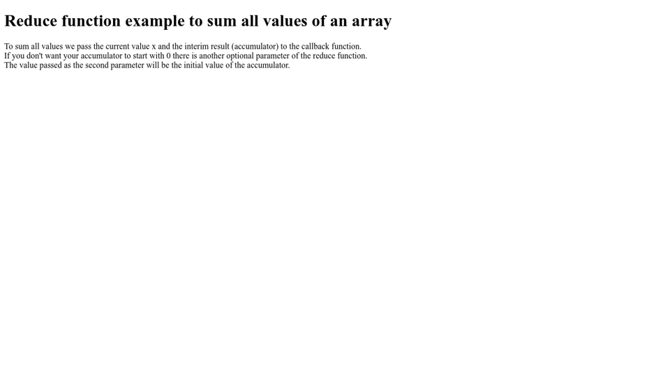 This article explains how the reduce() method works with code samples. The reduce() method operates on the items of an array and returns a single value. Let's go straight to the examples to see how it works. Syntax reduce (callback) reduce (callback, initialValue) initialValue parameter is optional. If you don't specify an initial value, it will be the first item of the array. Javascript ES6 reduce() method and how to use it July 27, 2018 by Azadeh, 3 min. We will talk about Javascript ES6 reduce() method and how to use it in this article. Among new ES6 features, reduce() method is one of the good and sometimes confusing ones. First we need to understand its syntax. The ES6 reduce() syntax So you know what Array reduce means. Isn't that awesome? It only took you one minute. You can now head on to the Mozilla Docs for Array.prototype.reduce for a more in depth overview. Map Reduce. When you hear people talking about "Map Reduce" they are just talking about a "pattern": Mapping over a collection and then reducing it. Yeah. Really ...