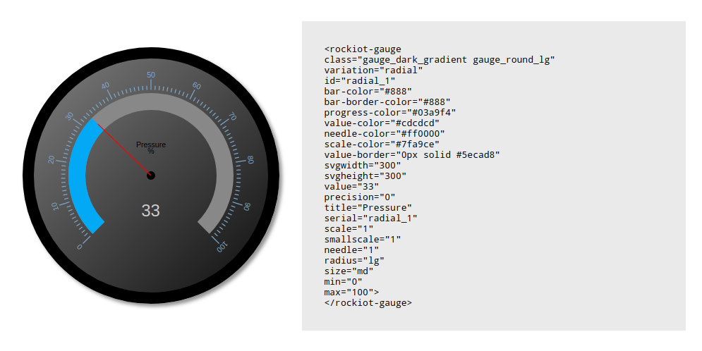 Established 2008. Open Source. RGraph uses the MIT license so it's completely unrestricted. HTML5 tech. RGraph uses HTML5 SVG, canvas and JavaScript. Pure JavaScript. Fast client-side JavaScript is used for easy integration with your sites. 50+ charts. RGraph has lots of charts and features. Open source. Chart.js is a community maintained project, contributions welcome! 8 Chart types. Visualize your data in 8 different ways; each of them animated and customisable. HTML5 Canvas. Great rendering performance across all modern browsers (IE11+). Responsive. Redraws charts on window resize for perfect scale granularity. Color of the gauge background. Optional. Default, the background-color specified in css or inline for this gauge element, #fff. data-color: string: Color of the gauge and value. Optional. Default, the color specified in css or inline for this gauge element, #8cc. data-max: float: Value that results in gauge completely filled. Optional. Default ...