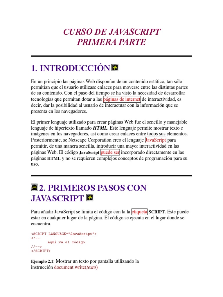 Taller de Javascript. Este manual te ofrece una lista de ejemplos generalmente sencillos y prácticos de desarrollo con Javascript con los que seguir aprendiendo. Manual de ES6. Este manual te ofrece todo lo que Javascript ha traído de nuevo en Javascript, en versiones modernas que actualmente soportan los navegadores. CURSO DE JAVASCRIPT PRIMERA PARTE 1. INTRODUCCIN En un principio las pginas Web disponan de un contenido esttico, tan slo permitan que el usuario utilizase enlaces para moverse entre las distintas partes de su contenido. Con el paso del tiempo se ha visto la necesidad de desarrollar tecnologas que permitan dotar a las pginas de internet de interactividad, es decir, dar la posibilidad al ...