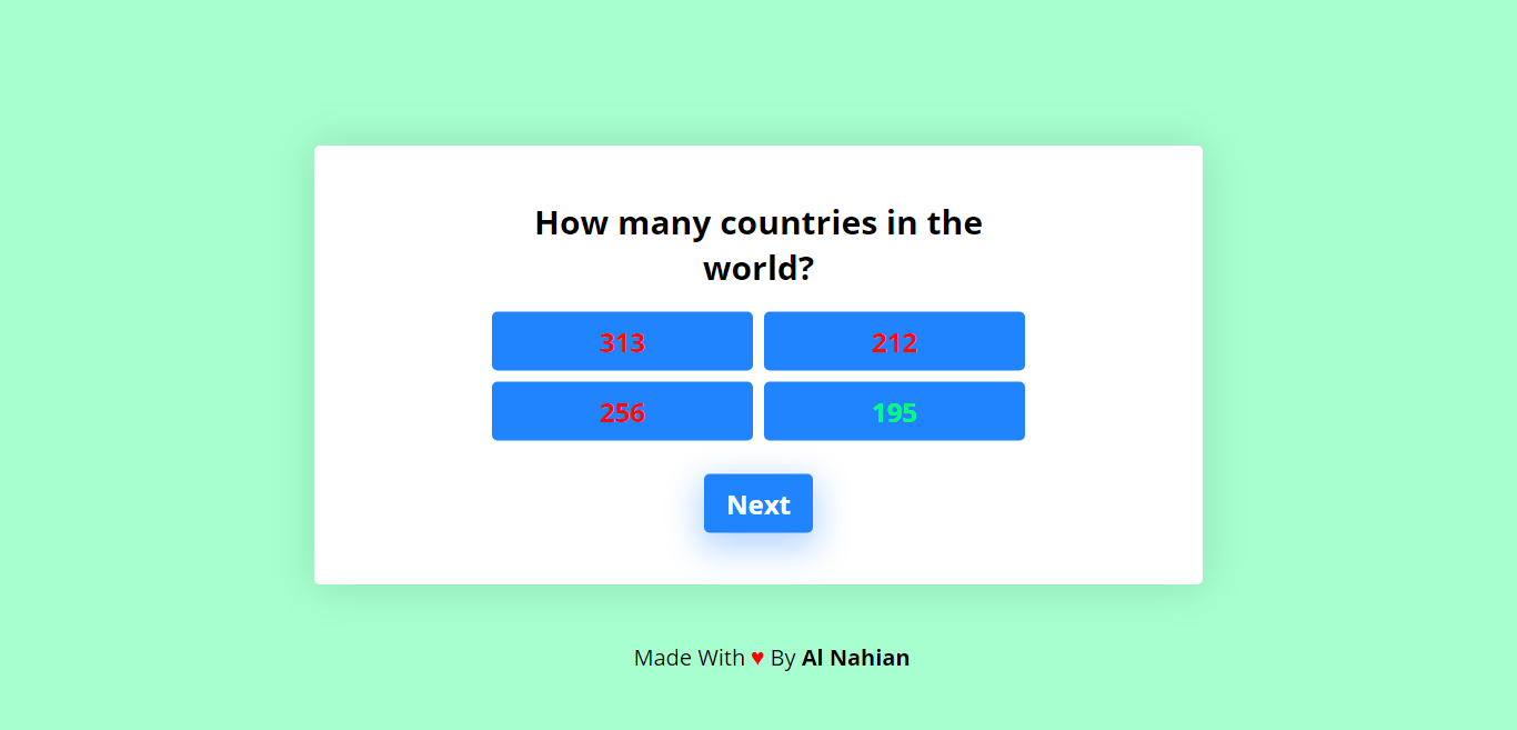 Today we're going to create a multiple choice quiz using JavaScript, in this quiz, the user will have to choose the correct answer out of three choices, in less than 10 seconds, if the user didn't answer didn't answer the question in 10sec, it will go to the next question automatically, and the question is marked wrong. the user has a progress bar, that shows the total number of question, and ... The quiz app will run in the browser and work as follows: On opening the page, the user will be shown a screen with rules and a start button. Upon clicking the button, the screen will show the first of 5 multiple choice questions and the timer will start counting down from 30 seconds. The primary goal of this project is to create an easily navigated and entertaining Quiz Game for my Milestone Project 2 at Code Institute. This game is designed for users of all age groups build using Html, CSS, and JavaScript. Site Goals. Create a fun quiz game to play. Create a website fully responsive on mobiles, tablets, and desktop devices.
