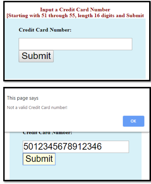 JavaScript validation with regular expression: Exercise-2 with Solution. Write a JavaScript program to check a credit card number. Here are some format of some well-known credit cards. American Express :- Starting with 34 or 37, length 15 digits. Visa :- Starting with 4, length 13 or 16 digits. MasterCard :- Starting with 51 through 55, length ... 7/8/2020 · Credit Card validation libraries:there are some awesome Credit card validation libraries but this solution comes with a set of problems: They usually include (a lot) more than I need – there can be (in this specific case are) thousands of tasks on a project, if I solved most of them by just including another library (“Throw money at it” attitude) in the project it would quickly snowball to a point of total un-maintainability. 21/7/2011 · This JavaScript article tutorial guides you a full completed instructions to validate a credit card number with JavaScript programming language, JavaScript RegEx. This post contains both detailed step by step guides and full JavaScript source codes for examples, please go to the inner post page for all.