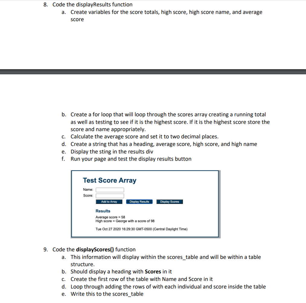 Having a score can also make the game more interesting — you can try to beat your own highscore, or your friend's. In this article we'll add a scoring system to our game. We will use a separate variable for storing the score and Phaser's text() method to print it out onto the screen. Jan 20, 2014 - I’m making a Javascript-based “game,” and I wanted to store the high scores. I’m storing everything in an array, converting it to JSON, and storing that in HTML5 Local Storage. Then I’m retrieving it from HTML 5 Local Storage (the JSON), converting back into an array, and adding the ... See the Pen javascript-math-exercise-6 by w3resource (@w3resource) on CodePen. Improve this sample solution and post your code through Disqus. Previous: Write a JavaScript function to format a number up to specified decimal places. Next: Write a JavaScript function to find the lowest value in an array.
