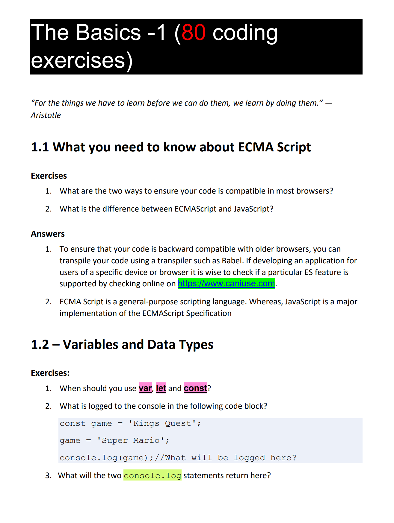 We have gathered a variety of JavaScript exercises (with answers) for each JavaScript Chapter. Try to solve an exercise by editing some code, or show the answer to see what you've done wrong. Practice Completing JavaScript Exercises & Challenges. Once you've started to build a basic knowledge of JavaScript for beginners you will need to start practicing your coding skills. One of the best ways to do this is through free online JavaScript exercises and challenges. These can be found through a quick internet search, and are a great ... The first 18 JavaScript projects above focuses only on coding the JavaScript functionality for front-end projects. In other words, the HTML and CSS assets are given to you in a starter file but you'd have to build the app.js file. Consider these 'warm up' projects.