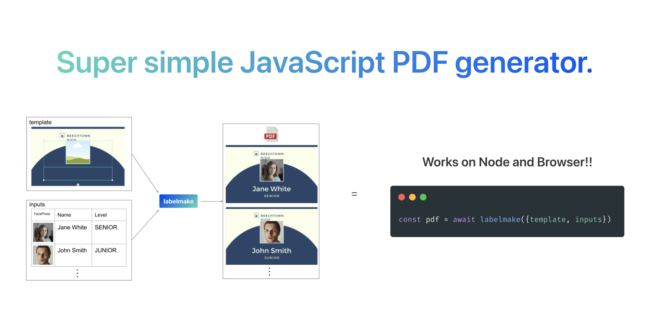6 days ago - Step 1 - install the pdf creator package using the following command · Step 2 - Add required packages and read HTML template follow. grepper; search snippets; faq; usage docs ; install grepper; log in; signup Usage. labelmake uses template and inputs to generate a PDF. * template is a JSON that has a base pdf data and a variable inputs area schema. * inputs has array in object values to be entered into "template". Array corresponds to each page of the PDF. Labelmake Example Embedpdf - StackBlitz.