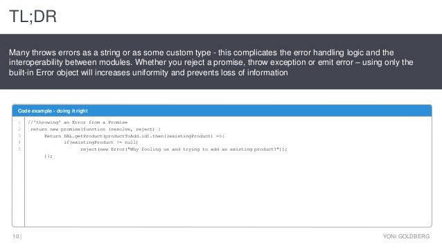 An exploration of different ways to handle errors with JS promises and async/await, with the advantages and problems of each. Tagged with javascript, promises, node, errors. Nov 09, 2018 - Tried catching promises thats another bad dream when things get complicated. The result? Unhandled Promise Rejections! The most annoying about not handling these rejections is it does not tell us where the error is! Us node/javascript developers know this all too well, it is a nightmare. What is a Promise in JavaScript? A promise is an object which handles asynchronous requests. When the implementation is correct, it will always promise that you will get a single response (either...