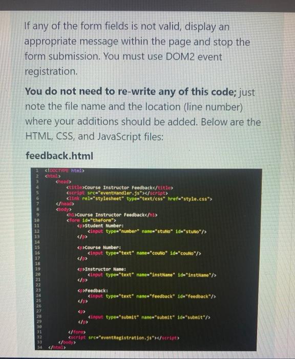 Feedback form validation in javascript. Server Validation. The HTML5 form validation techniques in this post only work on the front end. Someone could turn off JavaScript and still submit jank data to a form with the tightest JS form validation. To be clear, you should still do validation on the server. How you display those errors to a user is up to you. The fields for the feedback forms vary for the organizations and their services, but there will be a common layout for all those forms, such as first name, last name, mail ID and feedback section. Creating this kind of forms using HTML is not a tedious process. In this article, we will discuss creating a feedback form using HTML for web ... sample-registration-form-validation.js is the external JavaScript file which contains the JavaScript ocde used to validate the form. js-form-validation.css is the stylesheet containing styles for the form. Notice that for validation, the JavaScript function containing the code to validate is called on the onSubmit event of the form.