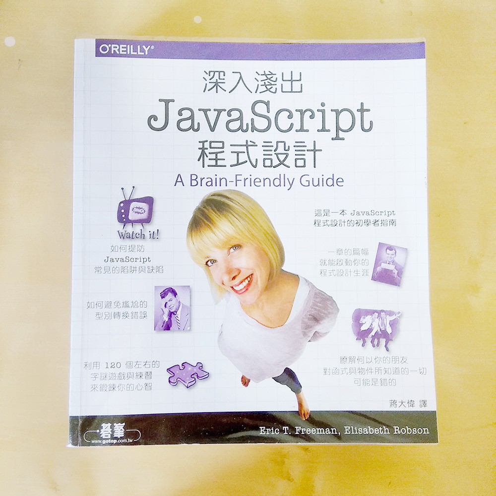 我們認為你的時間寶貴,不應該浪費在與新概念周旋不下的窘境中。. 《深入淺出 JavaScript 程式設計》採取了專為大腦運作而設計的豐富視覺化風格,運用認知科學與學習理論的最新研究成果,精心建構出引發多重感知的學習體驗,讓你輕鬆瞭解 JavaScript 程式設計,而且不容易忘記。. 回頁首. Eric 深入淺出系列的共同創始人,Kathy Sierra 對他的評語為『他是一個文藝黑客 ... 你可以先從簡單的特性開始,如跑馬燈、相簿、動態版型、回應按鈕點擊等。. 在你熟悉的這個程式語言以後,甚至可以製作遊戲、2D平面以及立體的圖像、資料庫系統等等的應用!. JavaScript 本身非常的簡潔,卻也充滿彈性,開發者們已經以 JavaScript 核心為基礎為她撰寫了相當多的工具,讓各位可以感到事半功倍。. 這些工具包括:. 內建在瀏覽器內的應用程式介面 ... 由多位 JavaScript 專家編寫而成,本書透過實務性的範例,清晰地描繪出每一項至關重要的 JavaScript 核心觀念與技巧。 引領你重溫許多常用、但卻未必精通的 JavaScript 機制,例如函式(function)、閉包(closure)、物件(object)、原型(prototype)及約定(promise)等。