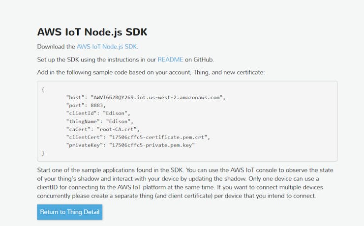 AWS IoT SDK for JavaScript. Simply follow the NPM installation steps: npm install aws-iot-device-sdk . Note that there will be two missing optional dependencies utf-8-validate@1.2.1 and bufferutil@1.2.1 that can be ignored. Make sure you have copied proper certification files to ~/certs directory before running the examples. You signed in with another tab or window. Reload to refresh your session. You signed out in another tab or window. Reload to refresh your session. to refresh your session. The AWS Management Console provides a web-based interface for accessing and managing all your AWS IoT resources. Programmatic access to AWS IoT Core is enabled by the AWS CLI and AWS SDK. You can also use the AWS IoT Device Client reference implementation. To connect your hardware device, sensor, mobile app, or thing, use the AWS IoT Device SDK ...