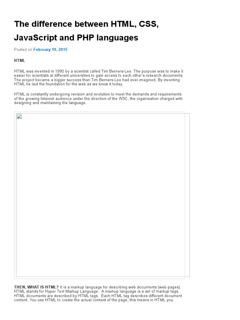 Difference between JavaScript and PHP Both JavaScript and PHP are two of the most popular and versatile programming languages used for website development. Many programmers would agree it's not fair to compare one with the other because they have different purposes when it comes to website development. While JavaScript is a client-side scripting language, PHP is the most popular server-side JavaScript is programming language. HTML, CSS, XML, and SQL are shortcuts, while JavaScript is not. PHP was primary made for web application at server side, while JavaScript for Web applications at user side. PHP is best for applications of type serve and die and JavaScript is May 24, 2015 - HTML HTML was invented in 1990 by a scientist called Tim Berners-Lee. The purpose was to make it easier for scientists at different universities to gain access to each other's research documents. The project became a bigger success than Tim Berners-Lee had ever imagined.