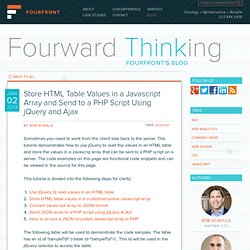 javascript/jQuery to read the values in an HTML table - store-html-table-values-in-a-javascript-array/table.html at master · rscavilla/store-html-table-values-in-a-javascript-array Since JavaScript doesn't provide any inbuilt functions to sort a table we will be required to use native methods to sort a given table. We will look into the methods in this article. Approach: Nov 25, 2014 - In today's article, I'll show you how to dynamically transform the contents of a one-dimension array into an HTML table on both the server and client, using PHP and JavaScript respectively. ... For the purposes of today's examples, the display function expects an array of objects where each ...