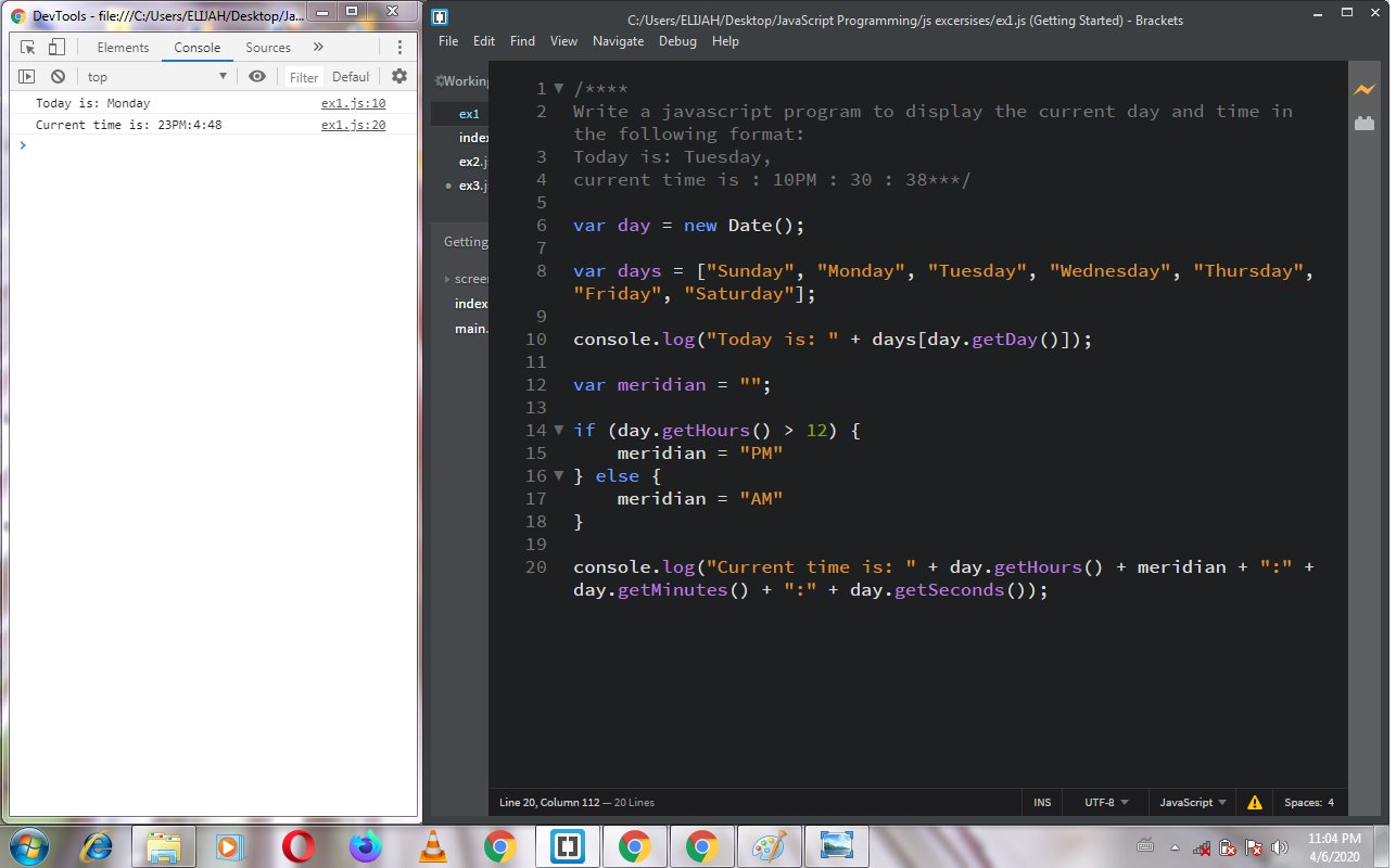 Definition and Usage. The getDay () method returns the day of the week (from 0 to 6) for the specified date. Note: Sunday is 0, Monday is 1, and so on. May 22, 2017 - How do I show the current time in the format HH:MM:SS? 26/2/2020 · JavaScript Basic: Exercise-1 with Solution. Write a JavaScript program to display the current day and time in the following format. Today is : Tuesday. var today = new Date(); var day = today.getDay(); var daylist = ["Sunday","Monday","Tuesday","Wednesday ","Thursday","Friday","Saturday"]; console.log("Today is : " + daylist [ day] + "."); var hour ...