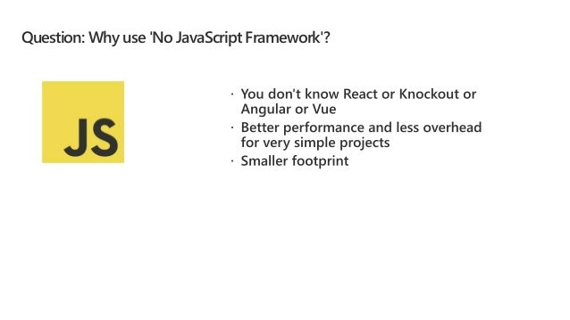 Why use a javascript framework. Another major reason for the immense popularity of the Vue.js framework is that it can be easily integrated with other types of web applications. This is mainly due to the fact that the Vue.js framework was built based on the JavaScript framework. I was wondering after reading your post, why not use it? Since I still use frameworks like Bootstrap that make compulsory use of JQuery, so I won't waste my code with another library, and my development has always been agile with Bootstrap, so it won't be in 2019 that I will pause, perhaps outright, with jQuery. If you absolutely must use a JavaScript framework (development skills across the team aren't high enough to write vanilla JavaScript and there's not time/money/interest in training the team and improving their skills, there is a real, not perceived, business need to support very old and outdated browsers, etc…) for server rendered ...