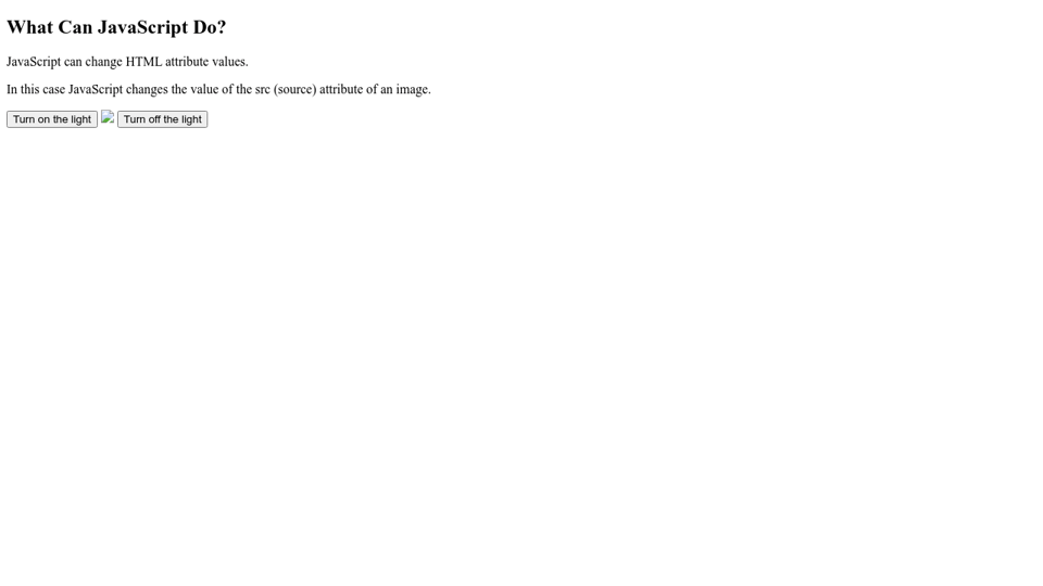 < p > JavaScript can change HTML attribute values. </ p > < p > In this case JavaScript changes the value of the src (source) attribute of an image. </ p > < button onclick = "document.getElementById('myImage').src='pic_bulbon.gif'" > Turn on the light </ button > The attr() Method¶. The .attr() method is used to get the attribute value for only the first element in the matched set. To get the value for each element separately, you can use a looping construct such as the .each() or .map() method. changing a src of an image in javascript. javascript set srs of image. get img tag using src javascript. get img tag src javascript. javascript change image type in url. js src attribute for image. edit src in javascript. src attribute to the img element in javascript. setting image src in javascript.