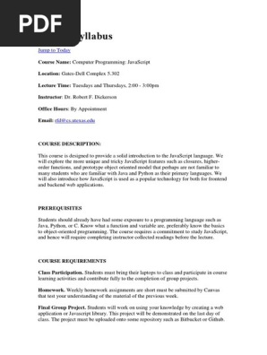 Students learn material equivalent ... program in JavaScript upon completion. ... To view the entire syllabus, click here or click to explore the full course. ... Explore programs that your students will build throughout this course! ... Here are a few examples of teacher resources ... Learn Javascript from top-rated instructors. Find the best online Javascript classes and start coding in Javascript today. Javascript is an object-oriented computer programming language that's commonly used by web developers and front-end engineers to create interactive websites You need to have JavaScript enabled in order to access this site. ... The Syllabus document, which provides an overview of the course, can be found here: CSCI E-3 Course Syllabus.