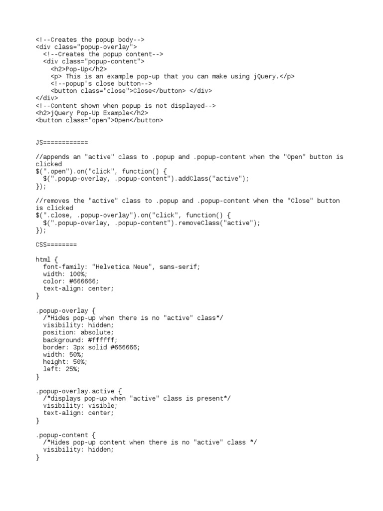 10/4/2012 · If the popup is from the same domain, the return value of window.open will be a reference to the popup's window object: https://developer.mozilla /en/DOM/window.open var popup = window.open("/relative path.html", ...); popup.onload = function() { // of course you can use other onload-techniques jQuery(popup.document.body).append("<div />"); // or any other dom manipulation } All you need to do is give the modal the show-modal class to open it. Removing this class will reset it back to hidden. JavaScript will handle this toggling for us. The use of modal popup is very common in web designing nowadays. Whether we are alerting the user or displaying an important message, we use a modal popup box. Generally, we need to use a jQuery plugin (or vanilla JavaScript) in order to create a modal dialog box. But, a simple modal (or alert box) can be created with only CSS. Yup! in this ...