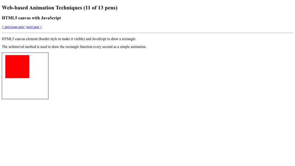 As we can see, the graph of the first half of the animation is the scaled down easeIn, and the second half is the scaled down easeOut. As a result, the animation starts and finishes with the same effect. More interesting "draw" Instead of moving the element we can do something else. All we need is to write the proper draw. In many times it is needed to run a JavaScript code periodically with a time interval. For example, in live online conversation or messaging system it needs to send AJAX request in every few seconds to check if there are any new message has been sent from the sender or not. In that case, the JavaScript AJAX code run periodically. While you can put setTimeout in a loop, the timers API offers the setInterval function as well, which would accomplish the requirement of doing something forever. Here's an example of setInterval: // example3.js setInterval( () => console.log('Hello every 3 seconds'), 3000 ); This example will print its message every 3 seconds.