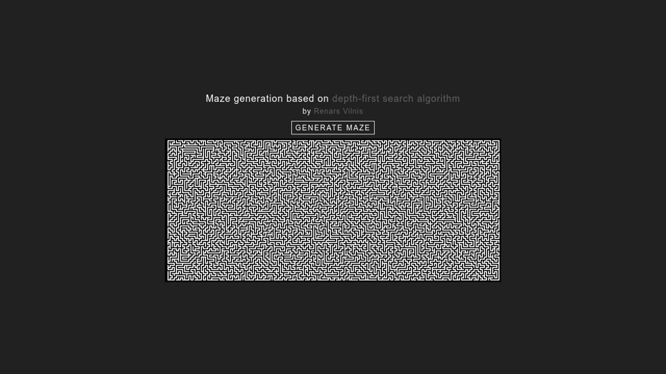 Maze generation algorithm javascript. I am trying to generate a maze using javascript (Depth First Search Algorithm). I have already read much on DFS Algorithms. But I am facing difficulty in generation of maze. The generated maze do not look like a maze at all. I am trying to follow the very basic one using stacks to keep the record of path followed to create a maze. Maze Generation Algorithms. As part of an idea to create a 3d maze game, I needed to be able to generate random maze layouts. After reading this wikipedia page, I got a general picture of how one might go about this task.I then came across this great article which went into a greated depth on more different kinds of algorithms and their properties. ... A maze is a type of puzzle involving a collection of paths, usually where a player has to find a route from start to finish. A huge variety of algorithms exist for generating and solving mazes. These are not only fun to implement, but also are a good way to familiarise yourself with programming ...