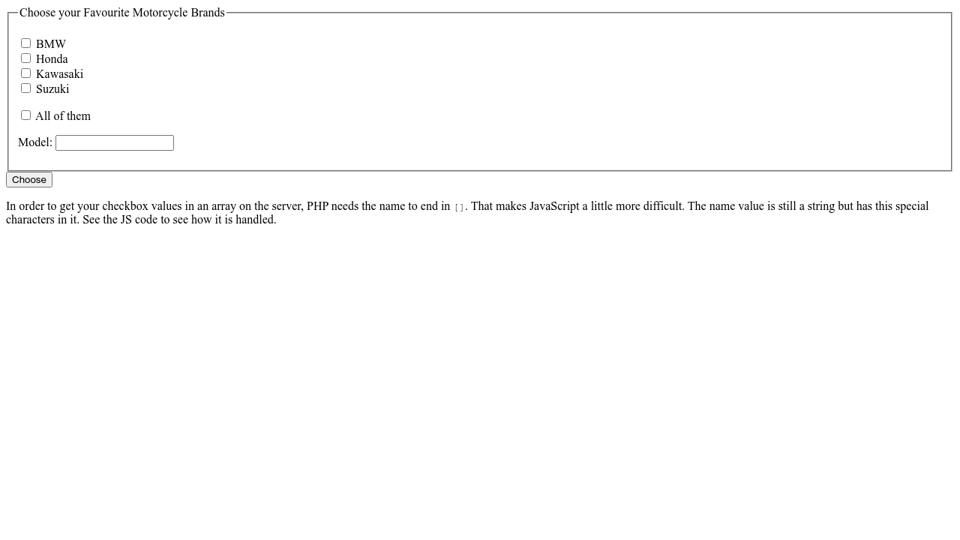 In the second method, we can simply access the PHP value direct in the JavaScript variable. You only need to initialize the variable in javascript and access the PHP value with all open and close PHP tag inside the Single Quotation mark ("). Let's see how we can pass the PHP variable to JavaScript. Pass PHP variables in JavaScript or jQuery Nov 11, 2011 - Let's say I have a javascript array with a bunch of elements (anywhere from 50-200). I want to send that to PHP (prepared statement) using ajax. Currently, I .load a php file many times inside of a loop, but I want to convert that into an array and send the array once, loading the PHP file ... ONLY FOR PHP! Before the toxic trolls get angry - Take extra note that the above array format works for PHP, but it can be different for other languages. For example, some languages may require all the name attribute to be the same instead: