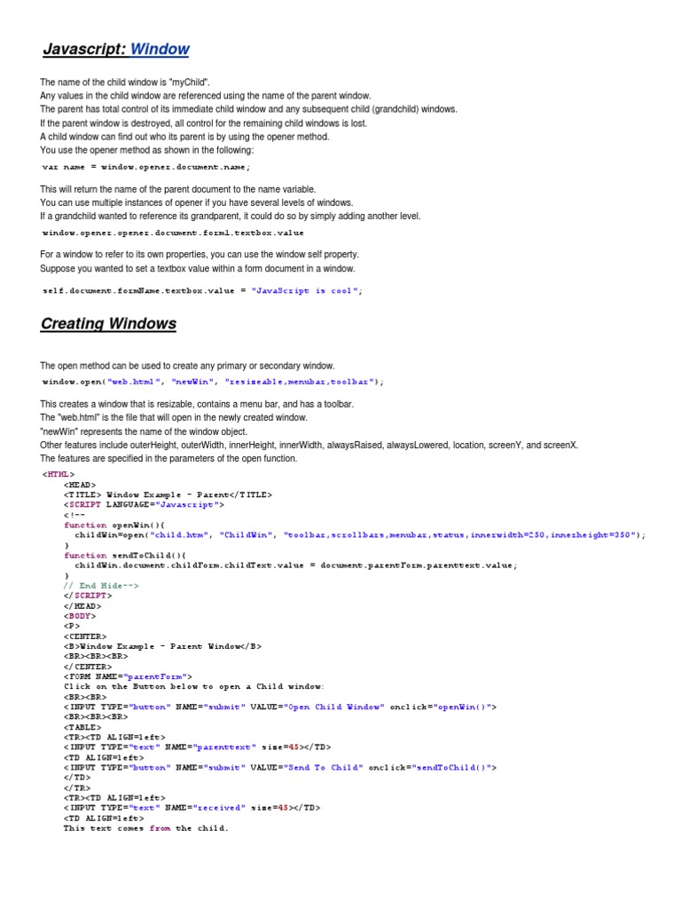 Well organized and easy to understand Web building tutorials with lots of examples of how to use HTML, CSS, JavaScript, SQL, Python, PHP, Bootstrap, Java, ...Resizable=yes|no|1|0: Whether or not the wind...Width=pixels: The width of the window. Min. val...Location=yes|no|1|0: Whether or not to display t...Status=yes|no|1|0: Whether or not to add a stat... resizable: By default these Javascript popup windows are not resizable. Adding "resizable" to the list of options will allow users to resize the window ... 12 Aug 2011 — var newwindow=window.open("one.html",'name','height=200,width=650,top= ...2 answers · Top answer: This code must be in child window function calledOnBodyLoad(){ setTimeout(resize_now, ...