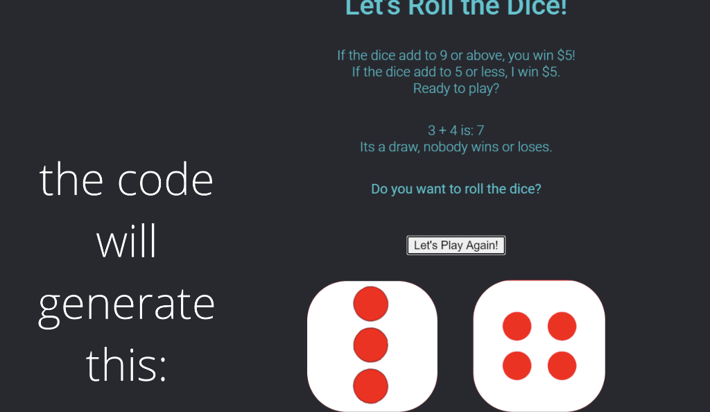How to make a dice game in javascript. After that set the dice image to none to hide the dice when the game loads. by typing document.querySelector('.dice').style.display = 'none'; Explanation:- We set the Scores to zero so that to reset the new game with player scores as zero. Then we set PlayerActive to zero so that the first player to start the game is player 1. This will be a tutorial covering how to create a 3D cube (a dice) in CSS and give it a rolling functionality, so you can roll to a random number between 1 and 6. We will be using HTML, CSS and JavaScript together to achieve the full functioning rolling dice with a button to trigger a roll. That wraps up the dice function. The next thing is telling the code what to do and how to act. Dice game. button.addEventListener ('click', dice); tells the Roll dice button to run the dice function whenever it is clicked. That ends the code, and you can see that our JavaScript dice game is functional.
