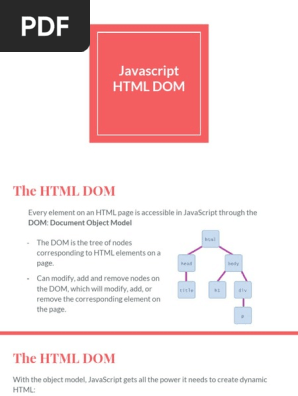 The Acrobat JavaScript DOM (Document Object Model) provides a single, easy to use Document Object property for accessing the PDF metadata, the info property. With this property we can get and set any metadata value, as well as create new metadata entries. DOM Scripting: Web Design with JavaScript and the Document Object Model focuses on JavaScript for adding dynamic effects and manipulating page structure on the fly using the Document Object Model. You'll start with a crash course in JavaScript and the DOM, then move on to several real-world examples that you'll build from scratch, including dynamic image galleries Document Object Model When a browser loads a web page, it creates a model of that page This is called a "DOM tree" and it is stored in the browser's memory Every element, attribute, and piece of text in the HTML is represented by its own "DOM node" Web Development and Programming CSCI-UA 61 JavaScript Document Object Model