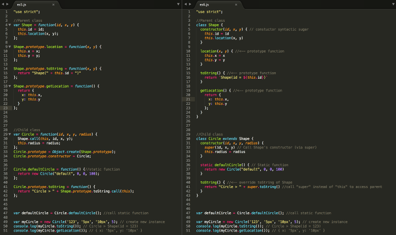 Jun 29, 2017 - TypeScript is very popular in the .NET world (and here at Wintellect) and CoffeeScript is kind of a big deal™ in the Ruby community. Both TypeScript and CoffeeScript provide syntactic sugar on top of ES5 and then are transcompiled into ES5 compliant JavaScript. ES6 will tackle many of the ... JavaScript Classes - ES5 vs ES6. An example that shows the difference between creating a JavaScript class and subclass in ES5 and ES6. * Shape class. * @param {String} id - The id. * @param {Number} x - The x coordinate. * @param {Number} y - The y coordinate. ECMAScript 6, also known as ECMAScript 2015, is a significant update to the language since ES5 was standardized in 2009. The 6th edition syntax includes classes and modules, for/of loops, arrow functions, promises and much more.