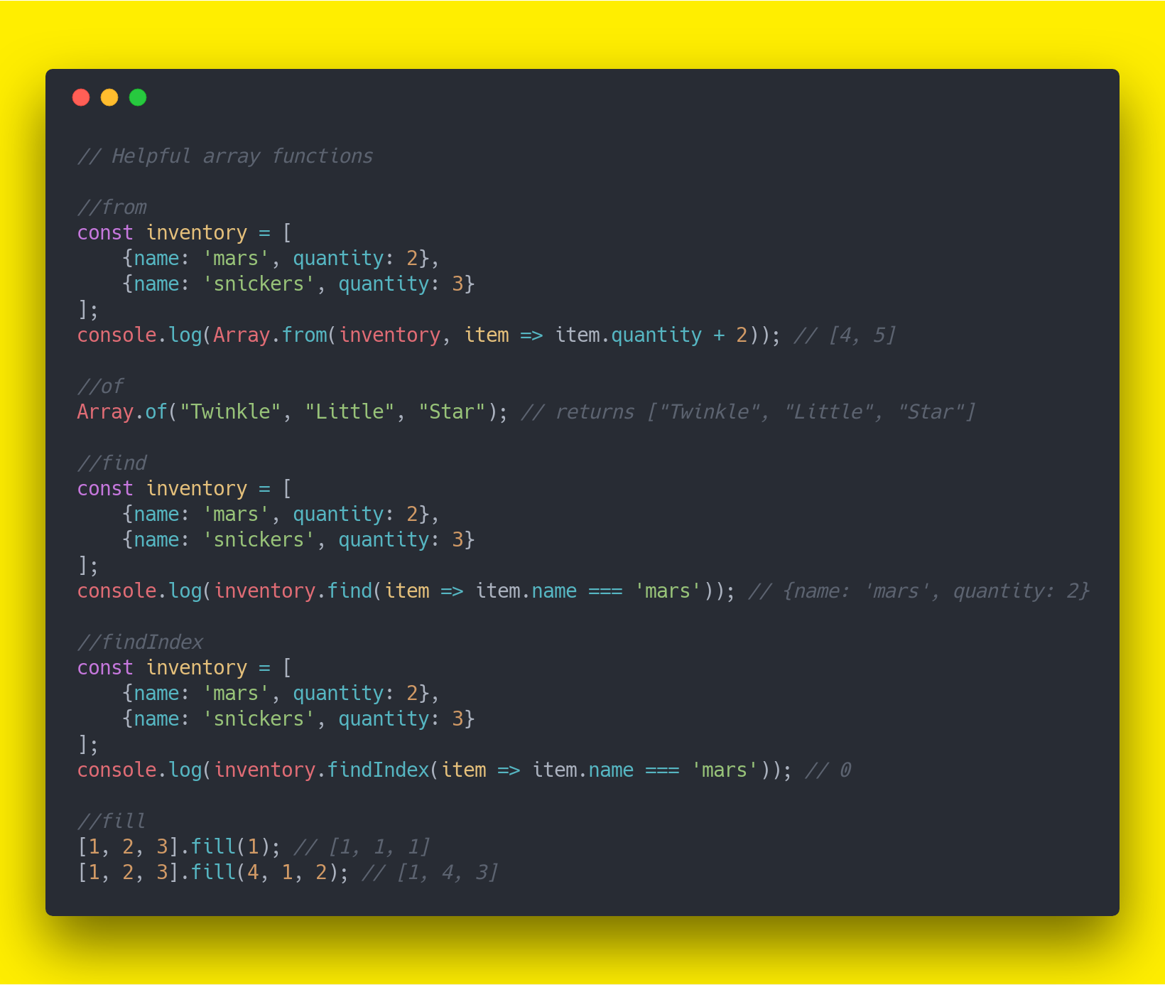 This forEach() method iterates the array in order and passes the index as the 2nd argument to the function. So, these are the ways through which you can iterate on javascript arrays in ES6. I hope you guys like the tutorial, feel free to drop any comments in the comment section down below. 38 Array Functions Javascript Es6 Written By Leah J Stevenson. Thursday, August 19, 2021 Add Comment Edit. Array functions javascript es6. Most Useful Javascript Array Functions Vegibit. Read Amp Write Array In Javascript Es6 Special Object. Belajar Javascript Es5 Dan Es6 Part 10 High Order Function. 2. Array.from() Let's see how the new Array.from() function works. Below we have set up an array with three values of 500, 700, and 1000. On the second line, we make a call to Array.from() and pass in prices as the first argument, and an arrow function as the second argument. By running the code, we see that the prices are now taxed at 5 percent.