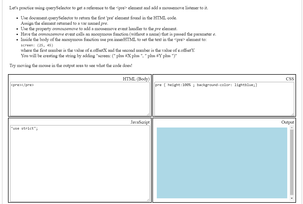 onclick. Fires when the user clicks on an element. A combination of onmousedown and onmouseup. onmousedown. FIres when the user holds the mouse down over an element. onmouseup. Fires when the user releases the mouse after having hold it down over the element. ondblclick. Fires when the user double clicks the mouse over an element. The JavaScript script presented in this page can be used to Get Mouse coordinates inside a HTML element, usually a Div or an Image. When mouse moves over the specified element, the X (horizontal) and Y (vertical) coordinates are displayed into a Div. get mouse position on click; click event get offset scroll; detect click position; get position of a div javascript onclick; canvas click x y; onclick click position; how to get four clicked mouse position; javascript click cordinates; Make a small canvas (200px x 200px) component that can display the position of two mouse clicks.