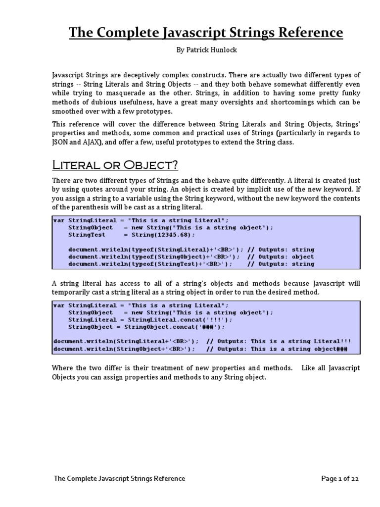 The point is, new String("123") creates a string wrapper object around "123", not just the primitive "123" value itself. [edited] Kyle Simpson's You Don't Know JS. One reason why you'd do this is: There's very little practical use for String objects as created by new String("foo"). 22/1/2019 · In general converting from anything to a string is usually a matter of calling the toString() method on any value, and JavaScript will create a string value corresponding to that type. Or you can pass any value to the String() global function. Casting from number to string. Use the String global function, or the Number type toString() method: "" + val: simply cast number to string — let's say inside of the .map() JSON.stringify(val): need to convert small non-nested object .toString(radix): convert number to hexidecimal or binary