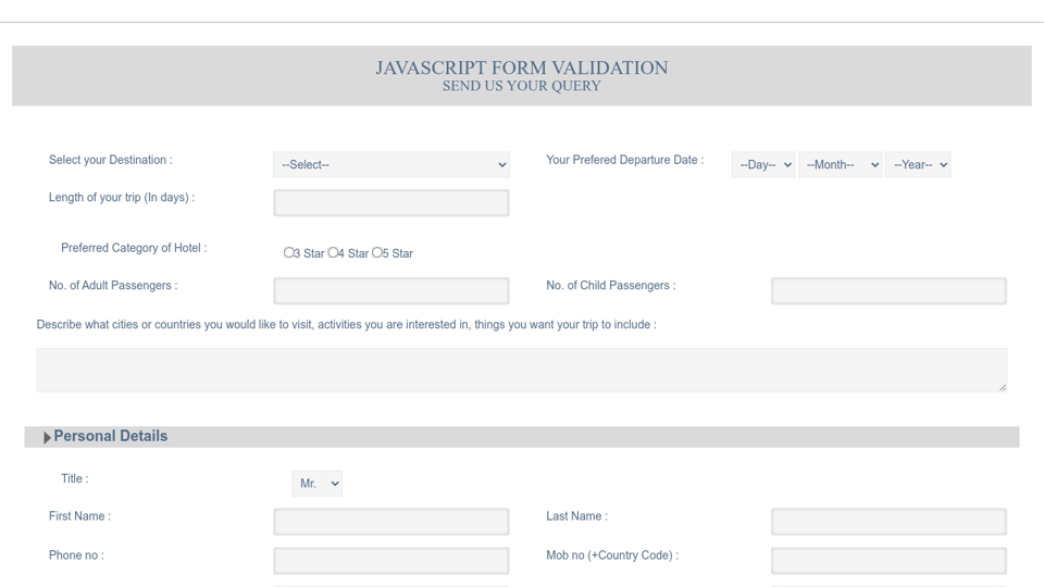 Javascript Phone Number Validation using JavaScript: International Phone Number Validation in Forms country_codes=['91-', 'UK-44-', 'SZ-268-22'] phone="91-123456789"; is_valid_number = country_codes.some(elem => phone.match('^' + elem)); console.log(is_valid_number ); ... javascript file with a file that returns true if the passed string looks like a valid South African phone number. 26/2/2020 · Phone Number validation. The validating phone number is an important point while validating an HTML form. In this page we have discussed how to validate a phone number (in different format) using JavaScript : At first, we validate a phone number of 10 digits with no comma, no spaces, no punctuation and there will be no + sign in front the number.