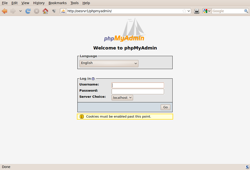 server is FC9 on the perfect setup. Everything runs great except when i log into phpmyadmin. I can login fine but on the right panel it says Cookies must be enabled past this point. I have cleared cookies, tried multiple browser, multiple computers and even deleted and installed he package multiple times. I cannot edit any DB's because of this. If we try to do a phpMyAdmin backup (also test connection), it fails with the following statement: https:///phpMyAdmin/ test failed. https:///phpMyAdmin/: Javascript must be enabled past this point! https:///phpMyAdmin/: Javascript must be enabled past this point! It used to work… the hoster has phpMyAdmin 4.8.4 installed. Any help would be very appreciated. Best regards, Daniel sudo mv phpMyAdmin-4.9.7-all-languages / /usr/share/phpmyadmin With that, you've installed phpMyAdmin, but there are a number of configuration changes you must make in order to be able to access phpMyAdmin through a web browser. Step 2 — Configuring phpMyAdmin Manually