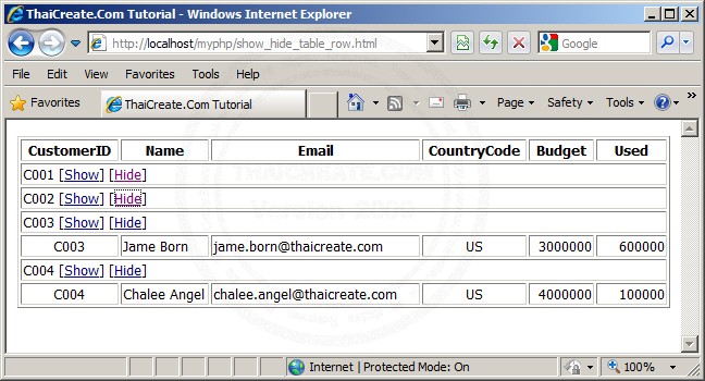 W3.JS HOME W3.JS Intro W3.JS Selectors W3.JS Hide/Show W3.JS Add Style W3.JS Add Class W3.JS Filters W3.JS Sort W3.JS Slideshow W3.JS Includes W3.JS Display W3.JS Http W3.JS Controllers W3.JS Servers W3.JS W3Data W3.JS Examples W3.JS References W3.JS Downloads Is it possible to have a show/hide click on link that would hide or show a row in one of my tables? Something that would hide the whole tags not just blank out a patch on my web page so a white ... You can also use some thing like below, give an id to your table like "my_table" so that in case of multiple table s in a page it will affect only specific table. and by using 2,3 you can refer row number #2 and #3 should be hide and #4, #5 means row number #4 and #5 should be display. Call it on click event of any thing and check.