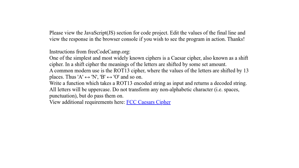 One of the simplest and most widely known ciphers is a Caesar cipher, also known as a shift cipher. In a shift cipher the meanings of the letters are shifted by some set amount. A common modern use... Brief video going over Caesars Cipher Bonfire BasicAlgorithm Scripting JavaScript FreeCodeCamp .Fan funding goes towards buying the equipment necessary t... Script with the implementation of Caesar Cipher and Decipher algorithms in JavaScript𝗗𝗼𝗻'𝘁 𝗳𝗼𝗿𝗴𝗲𝘁 𝘁𝗼 ...