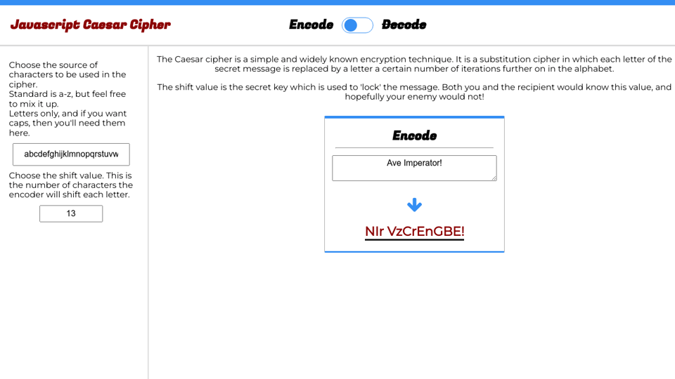 One of the simplest and most widely known ciphers is a Caesar cipher, also known as a shift cipher. In a shift cipher the meanings of the letters are shifted by some set amount. A common modern use is the ROT13 cipher, where the values of the letters are shifted by 13 places. Thus 'A' 'N', 'B' 'O' and so on. 25/3/2016 · function enterName () { var userName = document.getElementById ("word_in").value; //get the input string from the page var shiftBy = Number (document.getElementById ("shift").value); //get the amount of shift and convert it into a number. This Is IMPORTANT var size = userName.length; //get the size of the input string var encrypt = ""; var ...