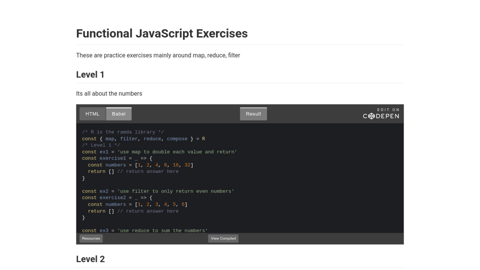 The "Monads Exercises" Lesson is part of the full, Hardcore Functional Programming in JavaScript course featured in this preview video. Here's what you'd learn in this lesson: Brian quickly runs through all 3 exercises for the Monad section. Exercises. We have gathered a variety of JavaScript exercises (with answers) for each JavaScript Chapter. Try to solve an exercise by editing some code, or show the answer to see what you've done wrong. Count Your Score. You will get 1 point for each correct answer. Your score and total score will always be displayed. Launching Visual Studio Code. Your codespace will open once ready. There was a problem preparing your codespace, please try again.