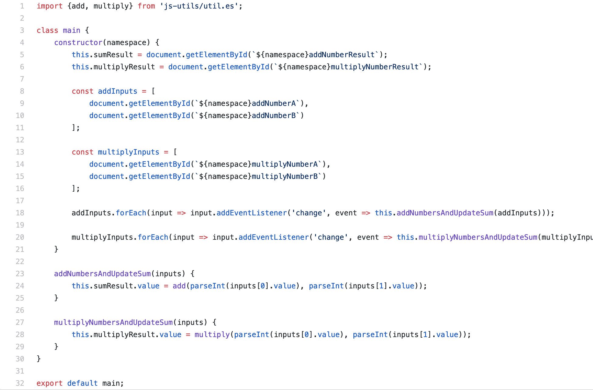 Importing Importing is also very straightforward, with the import keyword, members to be imported in curly brackets and then the location of the module relative to the current file: import { myLogger, Alligator } from 'app.js'; <script type="module"> import {example} from '/example.js'; example(); </script> /example.js export function example() { document.body.appendChild(document.createTextNode("hello")); }; However, this only allows me to import modules that are defined by separate external JavaScript files. I usually prefer to inline some scripts used for the ... 3. 4. <script type="module" >. import {order} from '/shop.js'; </script>. Use type="module" statement in the script tag and then import the function using import statement as shown above. 2. Assign the function to window object. Any method in a javascript module is available only within the scope of the module.