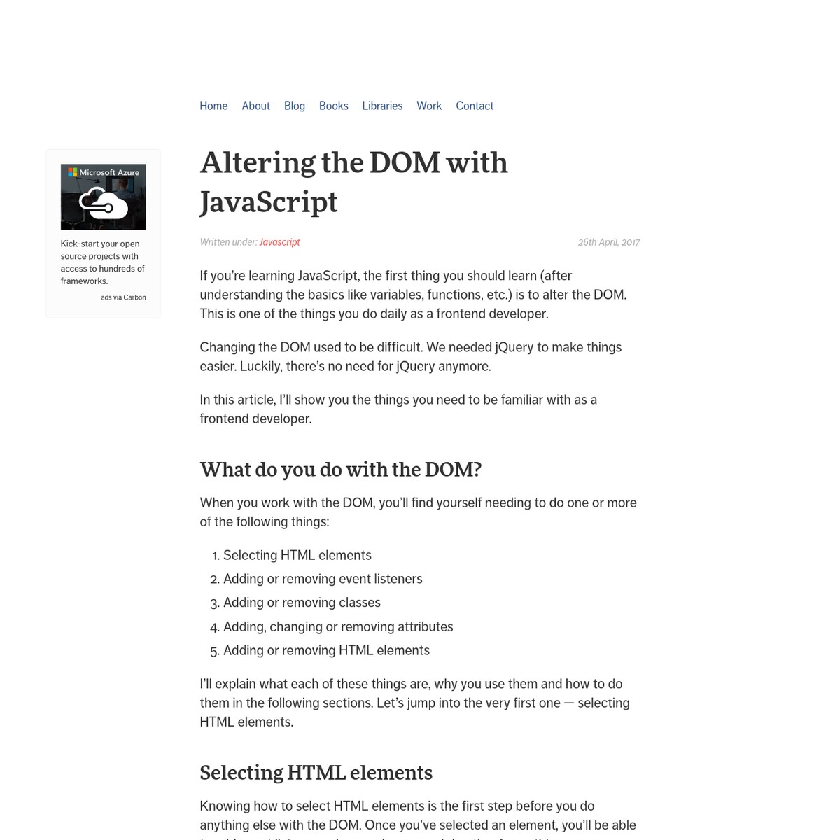 Aug 10, 2019 - When I first started learning web development on my own, I often struggled with finding the next step in my learning. I would go through several JavaScript courses on popular sites such as Coursera, Udemy, Udacity, PluralSight, and FreeCodeCamp. After completing a fundamentals course, I would ... How many projects have you built with HTML CSS and JavaScript? If you have built many different projects then you have two options. Continue JavaScript and become a front end developer or learn a back end Language like Ruby, PHP, and Python. NOTE:...