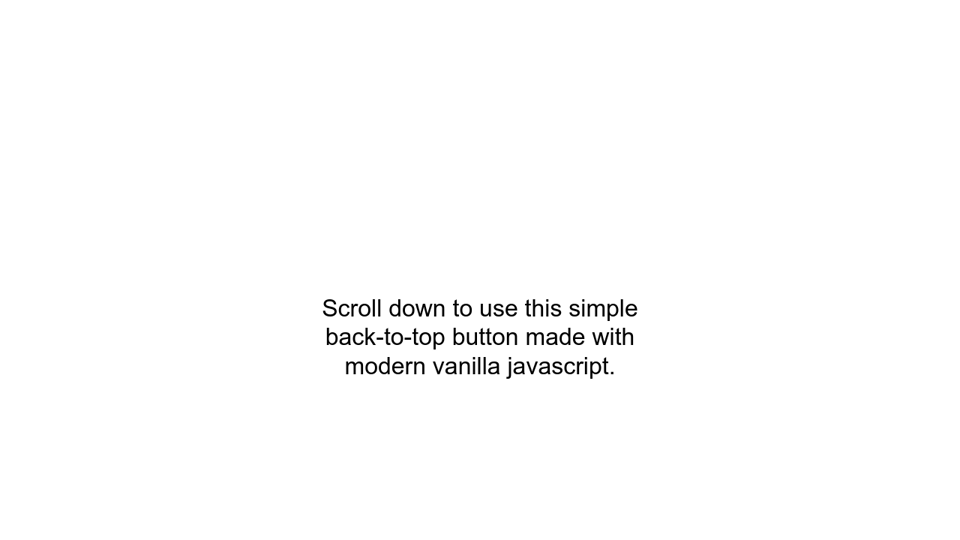 …is a sure bet to scroll the window (or any other element) back to the top. The scrolling behavior of that is determined by CSS as well, but if you aren't doing that, you can force the smoothness in JavaScript: window.scroll({ top: 0, left: 0, behavior: 'smooth' }); The above CSS is used to style the scroll-to-top button and the web page. You can play with the CSS code and style the button according to your requirements. Now you have a fully functional scroll-to-top / back-to-top button. If you want to have a look at the complete source code used in this article, here's the GitHub repository of the same. Also known as a scroll-to-top button or go-to-top image, the sticky back-to-top button is a helpful navigation element that helps users get back to the top of the web page they're viewing. A common UI pattern is to place this button in the lower right-hand corner of the screen, making it "sticky" via a fixed position so it's always ...