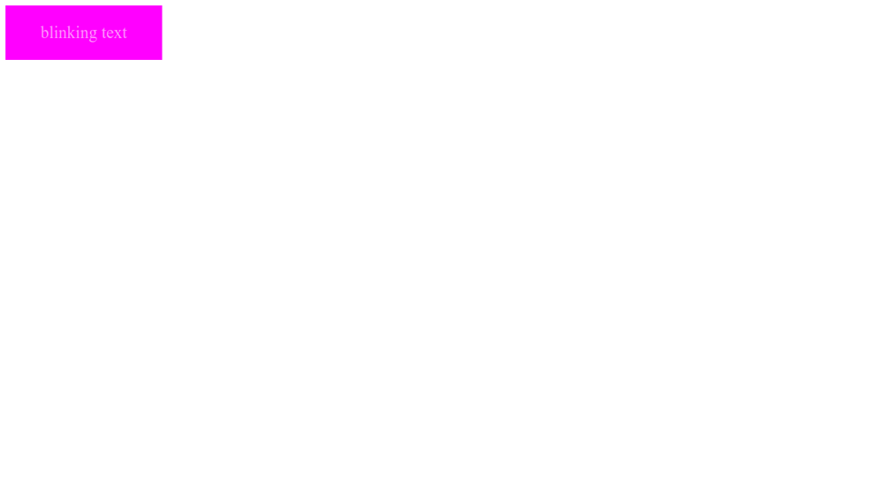 For example, the blink feature is supported by Netscape version 5.0. It is advised not to use the Blink Tag because if the browser does not support it, then chances are your page might get broken. As an alternative, web developers can use CSS along with JavaScript to create a blink effect on texts. Blinking text with HTML and CSS only I'm presenting a very simple way of making a fancy text blinking using only HTML and CSS3 . Adjust the values, setting a different blinking speed and colors. Blinking text was never part of HTML's standard functions, and there's no approach that works for every browser. The closest option that uses only HTML is the marquee tag, but even this does not work with Google Chrome. JavaScript is a...